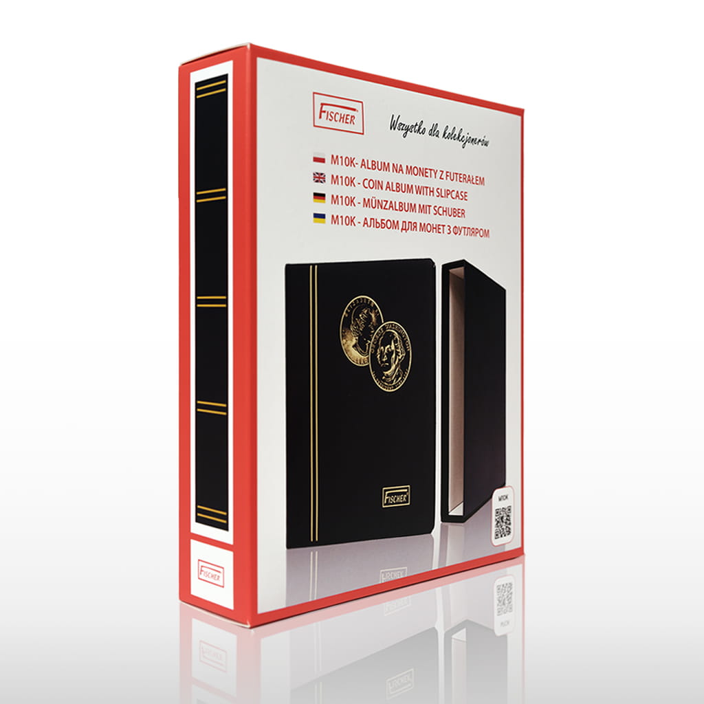 Album z futerałem.Klaser do monet M10k to najpopularniejszy klaser do monet wśród kolekcjonerów.Album zawiera 10 kart : karty na 30 monet każda, karty na 20 monet każda oraz karty na 12 monet każda.Sztywna okładka wykończona okładziną odporną na ścieranie,front okładki na gąbce.Mocowanie kart na zamku dwuringowym. Złocone paski na grzbiecie oraz wizerunek monety z okładce albumu.Karty oddzielone czarnymi przekładkami.Futerał w kolorze okładki.