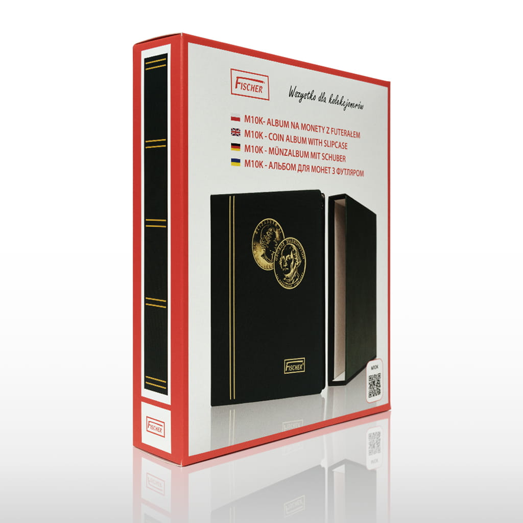 Album z futerałem.Klaser do monet M10k to najpopularniejszy klaser do monet wśród kolekcjonerów.Album zawiera 10 kart : karty na 30 monet każda, karty na 20 monet każda oraz karty na 12 monet każda.Sztywna okładka wykończona okładziną odporną na ścieranie,front okładki na gąbce.Mocowanie kart na zamku dwuringowym. Złocone paski na grzbiecie oraz wizerunek monety z okładce albumu.Karty oddzielone czarnymi przekładkami.Futerał w kolorze okładki.
