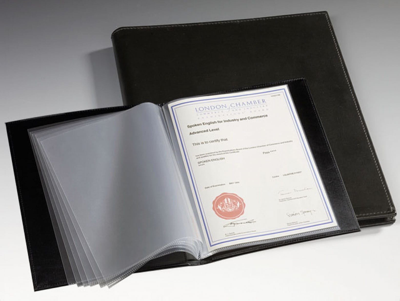 Album na 40 dokumentów formatu A4 (przy obustronnym wykorzystaniu).Wysokiej jakości album do przechowywania dokumentów,arkusików znaczków,akcji i historycznych papierów wartościowych,świadectw w formacie A4.Album z 20 przeźroczystymi kartami oprawionymi na stałe.Wymiar obwoluty 300 x 212 mm.Wysokiej jakości wykonanie z obszyciami na brzegach oraz stylowym,skóropodobnym wykończeniem.Kolor czarny.Zaokrąglony grzbiet.