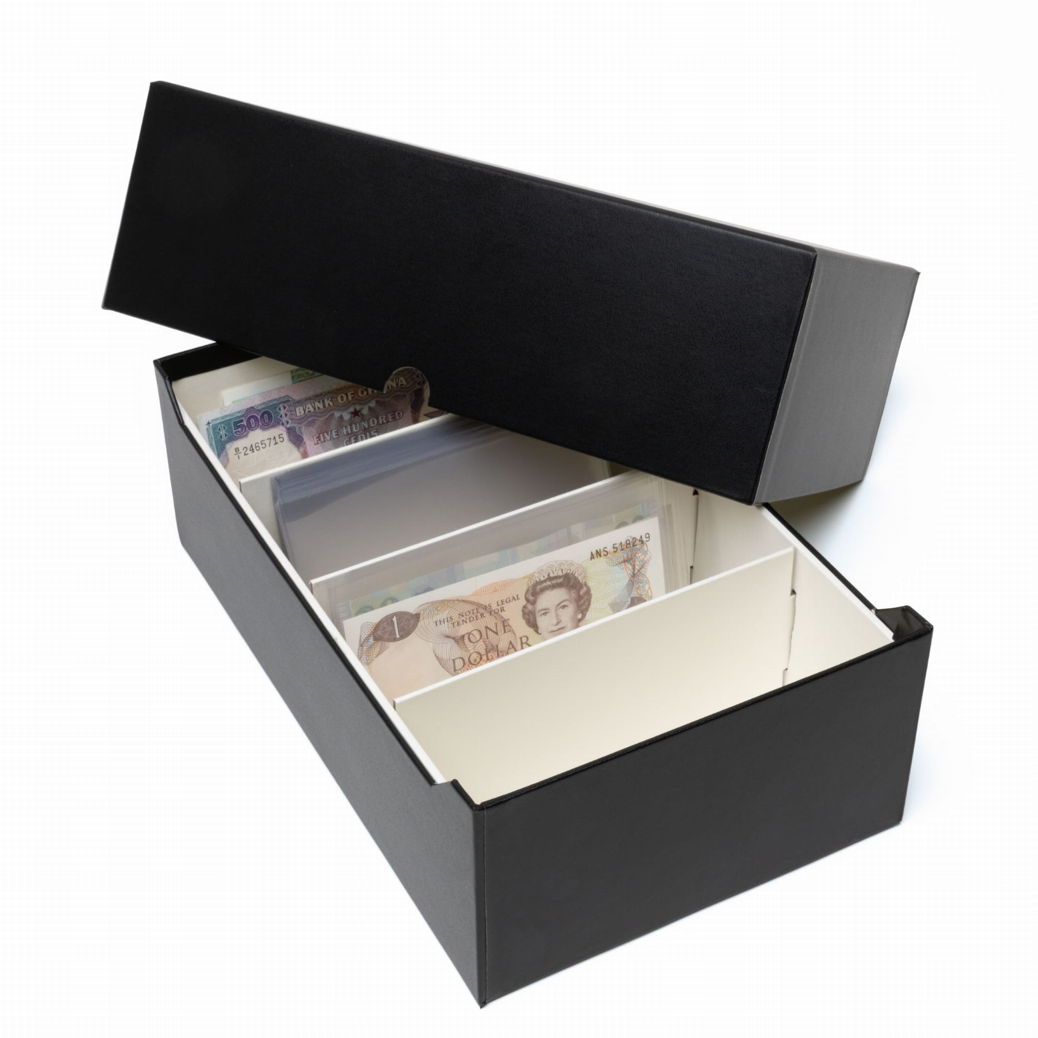 "Logik Box" to praktyczny sposób przechowywania i organizowania banknotów. Dzięki kompaktowym rozmiarom wygodnie zmieści się w każdym sejfie lub szafce, a jego konstrukcja z możliwością układania w stosy pozwala na przechowywanie wielu pudełek. Każde pudełko może pomieścić wiele banknotów i posiada przezroczyste okienko, które pozwala na szybką i łatwą identyfikację.